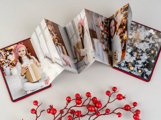 Kompaktna, a čarobna fotoknjiga (12 × 12 cm ali 10 × 14 cm) s prazničnimi barvami in zlatim potiskom. Popolna za manjše, a osebne spomine ali kot eleganten dodatek k večjim darilom.