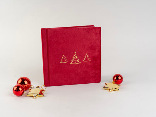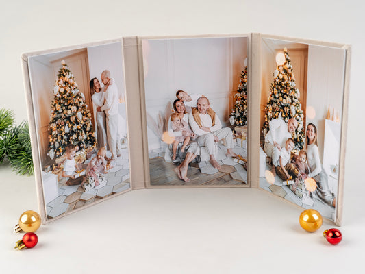 Eleganten album treh fotografij v velikosti 15 × 23 cm, ki povezuje vaše izbrane trenutke v prefinjen vizualni tok. Na voljo v praznično zelenih, rdečih ali bež žametnih barvah, z zlato potiskanimi motivi in subtilnimi gravurami. Idealno božično darilo za družino ali prijatelje.