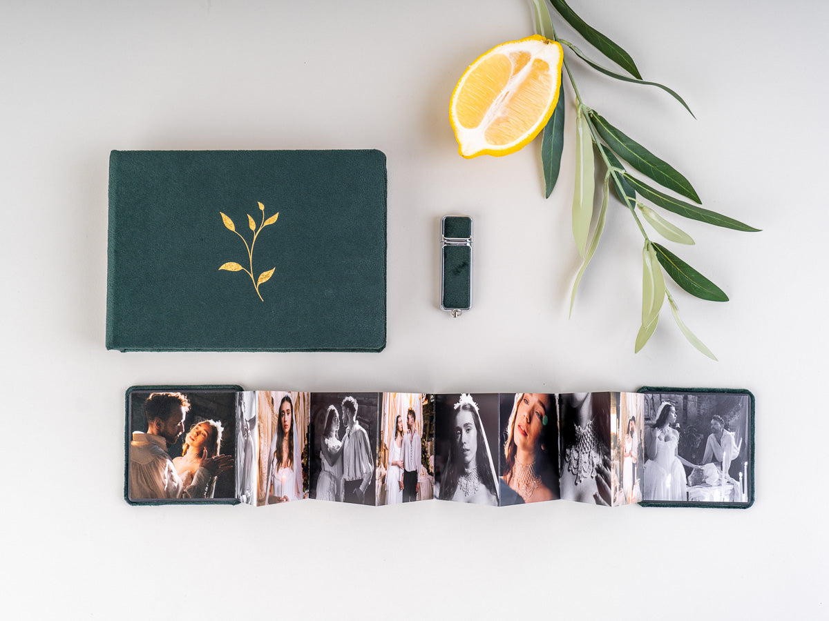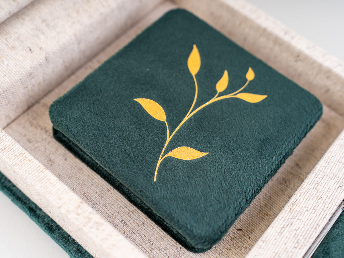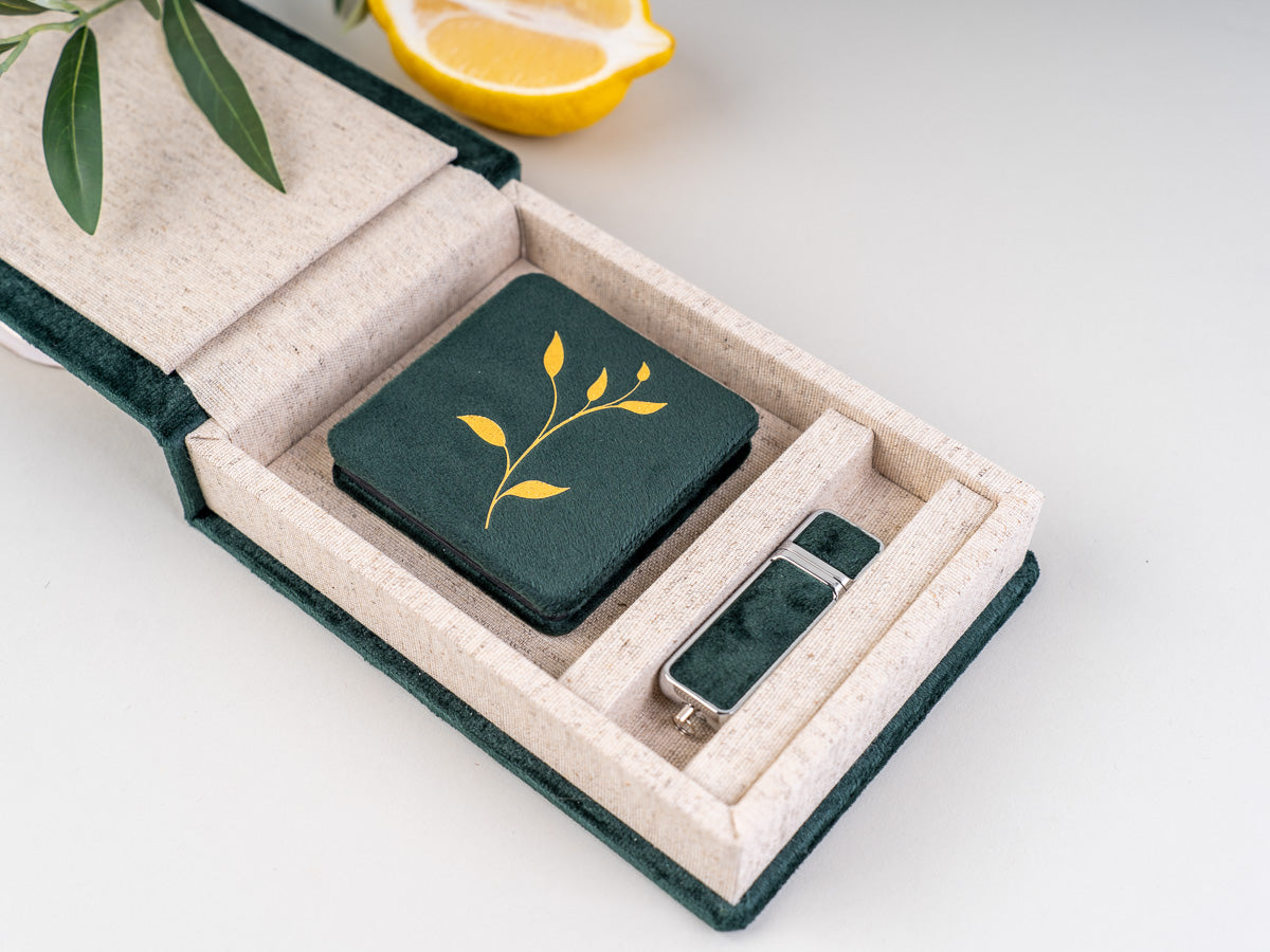 - Elegantna žametna škatlica – iz bogatega, mehkega žameta, s skrbno izbranim lanenim tekstilom v notranjosti. Barvna usklajenost USB-ja, fotoknjige in škatlice ustvari popolno celoto.