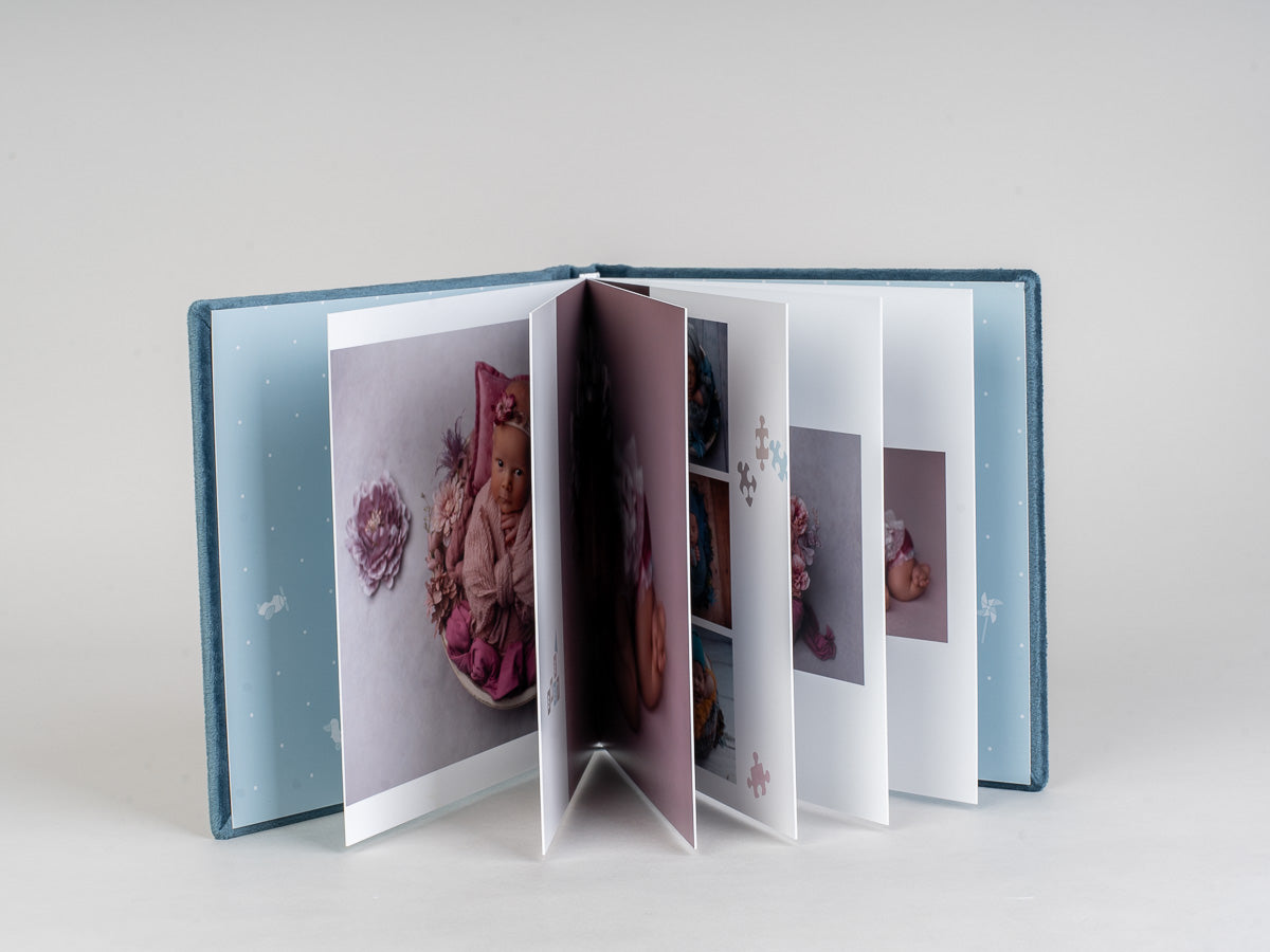 Ravne strani se elegantno odpirajo v popolnoma ravno površino, kar omogoča brezhibno panoramsko razporeditev fotografij. Fotografije so natisnjene na kakovosten trdi papir, ki zagotavlja dolgo življenjsko dobo in ohrani spomine generacijam.