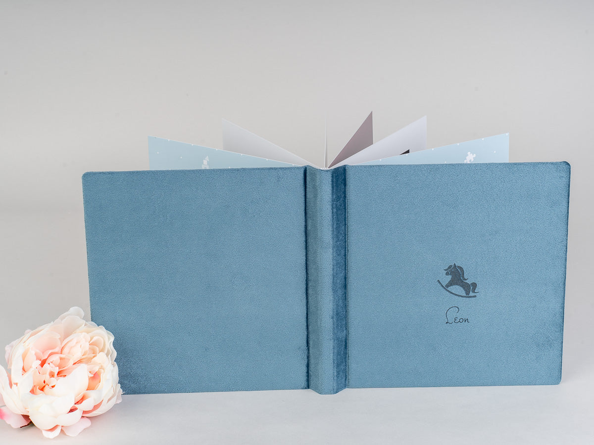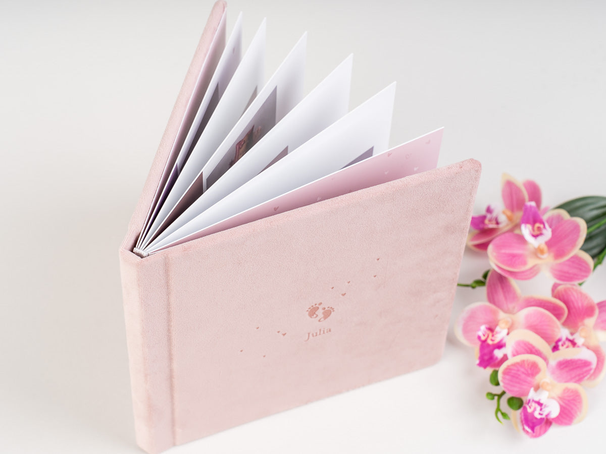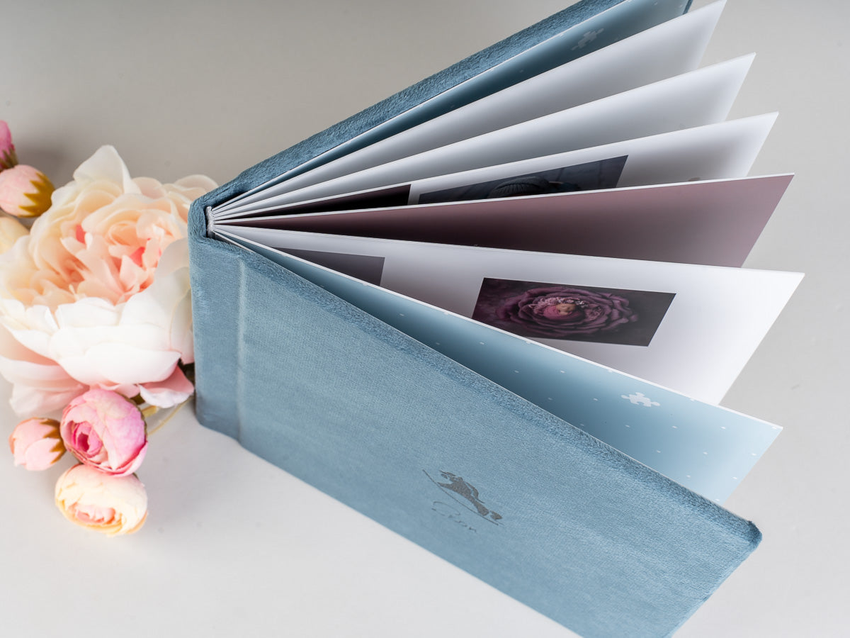 Album lahko vsebuje do 20 fotografij in omogoča izbiro med 3 nežnimi barvami žameta ter 3 čudovitimi motivi naslovnice, ki subtilno poudarijo vsebino albuma.