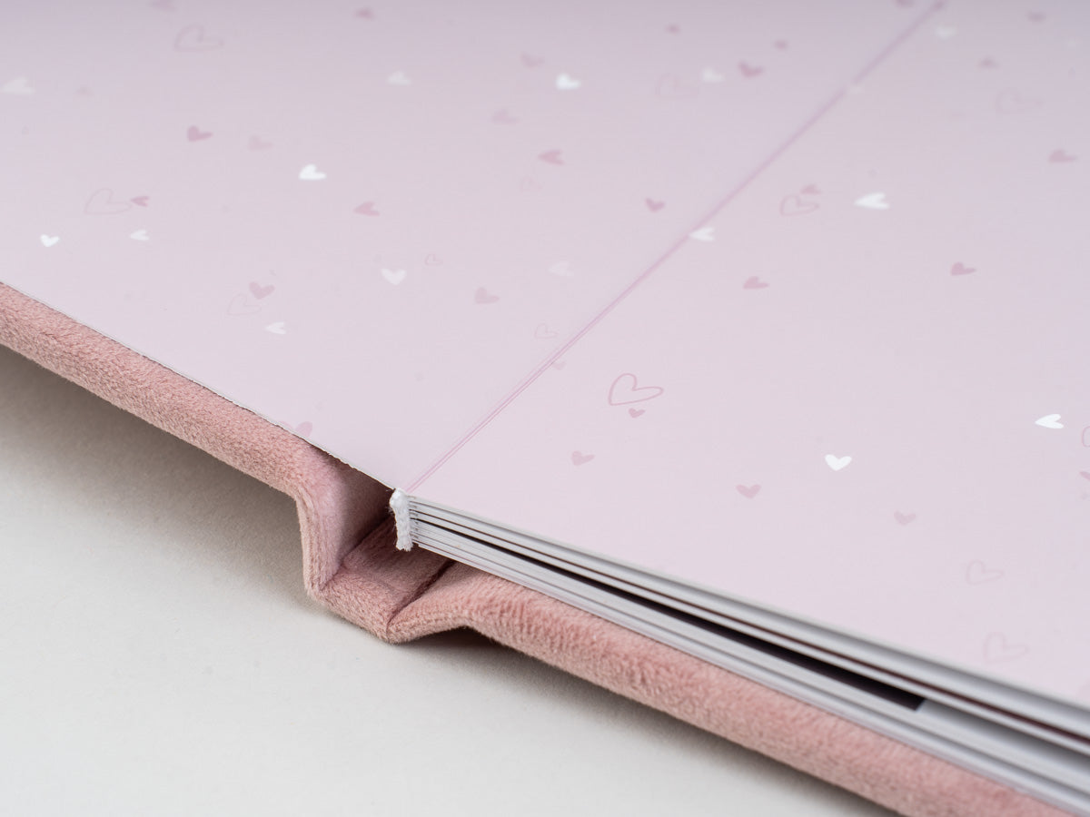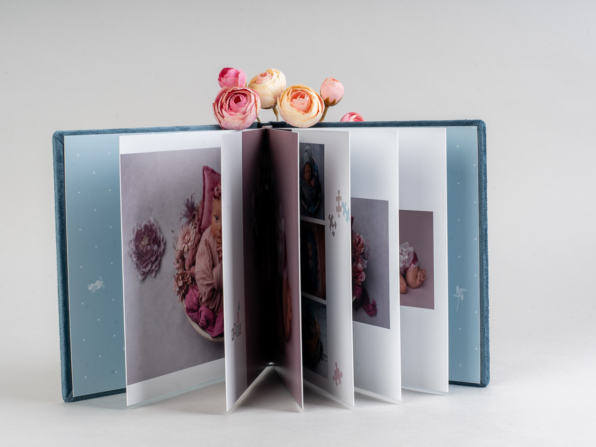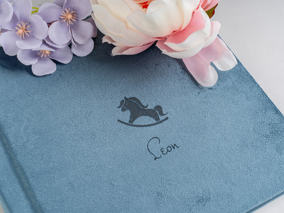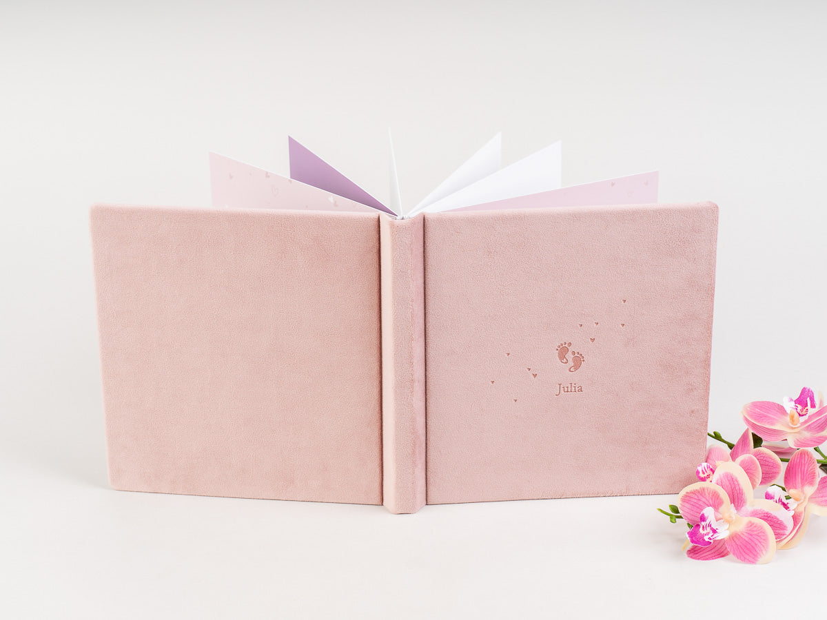 Album lahko vsebuje do 20 fotografij in omogoča izbiro med 3 nežnimi barvami žameta ter 3 čudovitimi motivi naslovnice, ki subtilno poudarijo vsebino albuma.