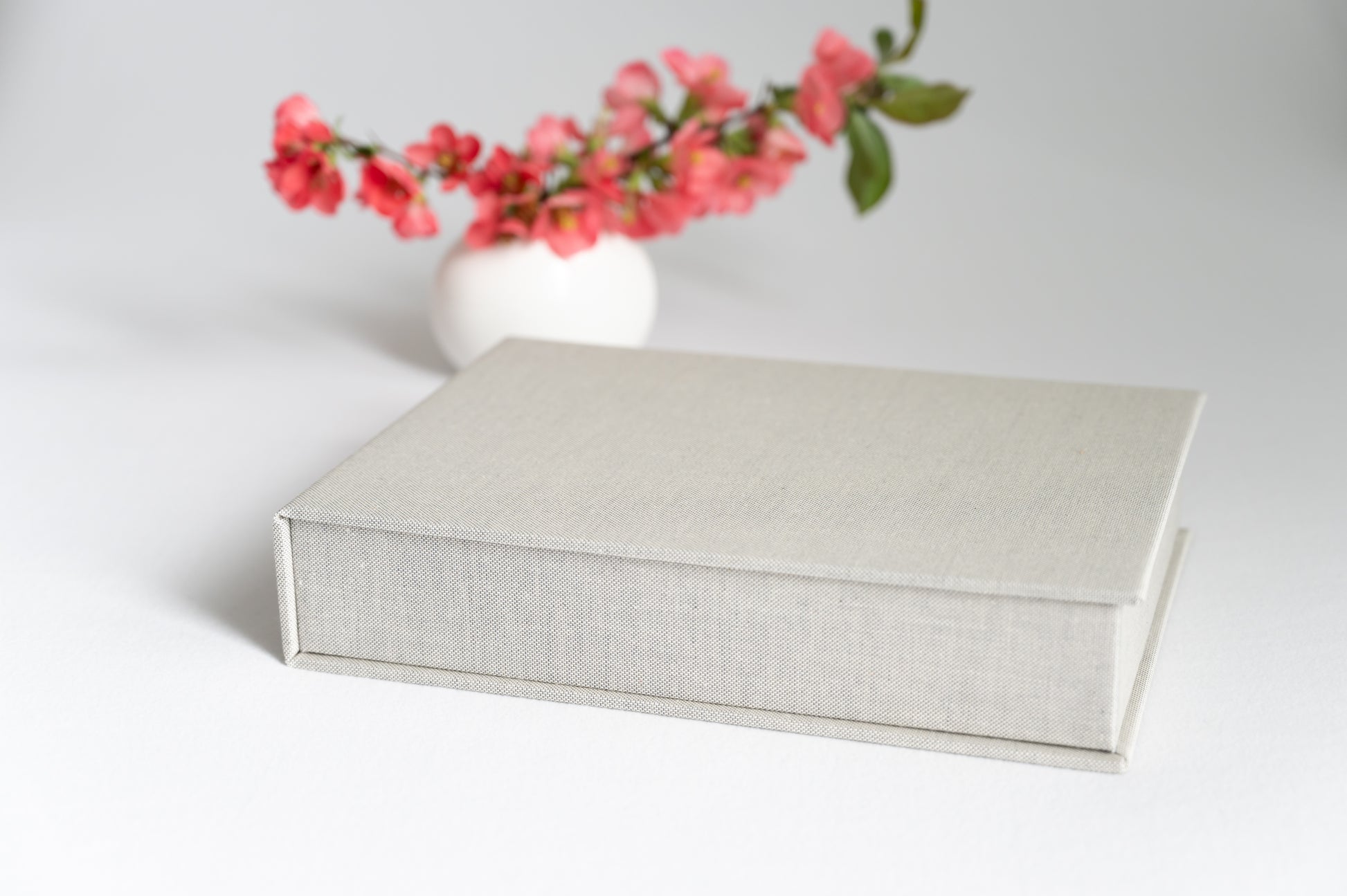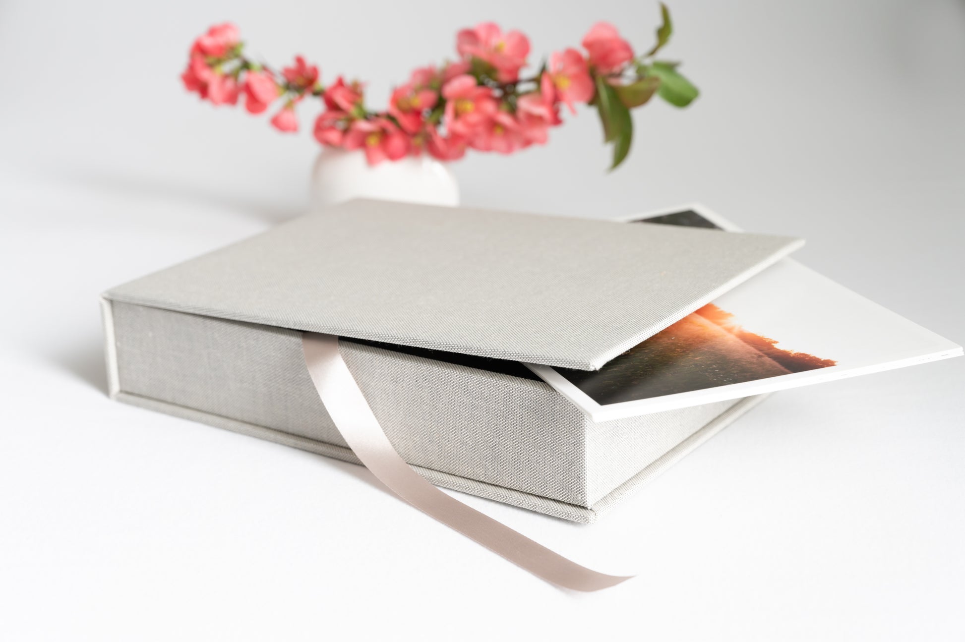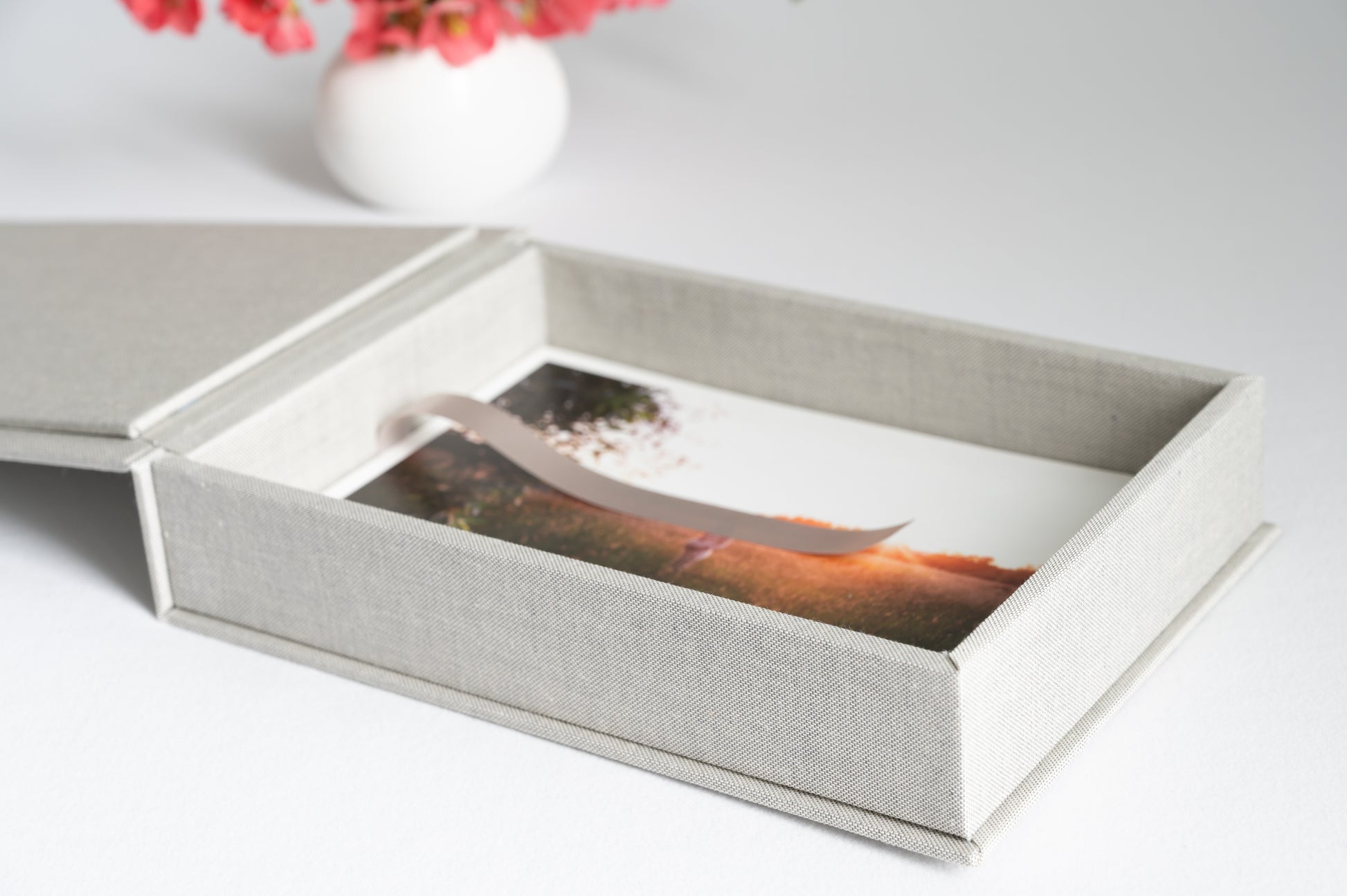 Škatla velikosti 23 x 15 cm in višine 3 cm lahko shranjuje do 100 fotografij, ki jih lahko naročite tukaj. Na voljo je z možnostjo personalizacije po vaši želji, poleg tega pa imate opcijo dodati 32 GB USB ključek, kjer lahko shranite digitalne kopije svojih najljubših trenutkov.